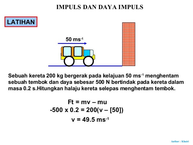 S mv - mu kadar perubahan momentum Unit bagi impuls kg m s N s Untuk daya impuls. Khairi Sebuah lori 1200 kg bergerak pada halaju 100 ms-1 menghentam sebuah tembokSelang masa tindakan antara lori dan tembok ialah 03 sTentukan daya impuls yang yang dikenakan pada lori. Secara matematik ini ditulis sebagai F m v m u t.