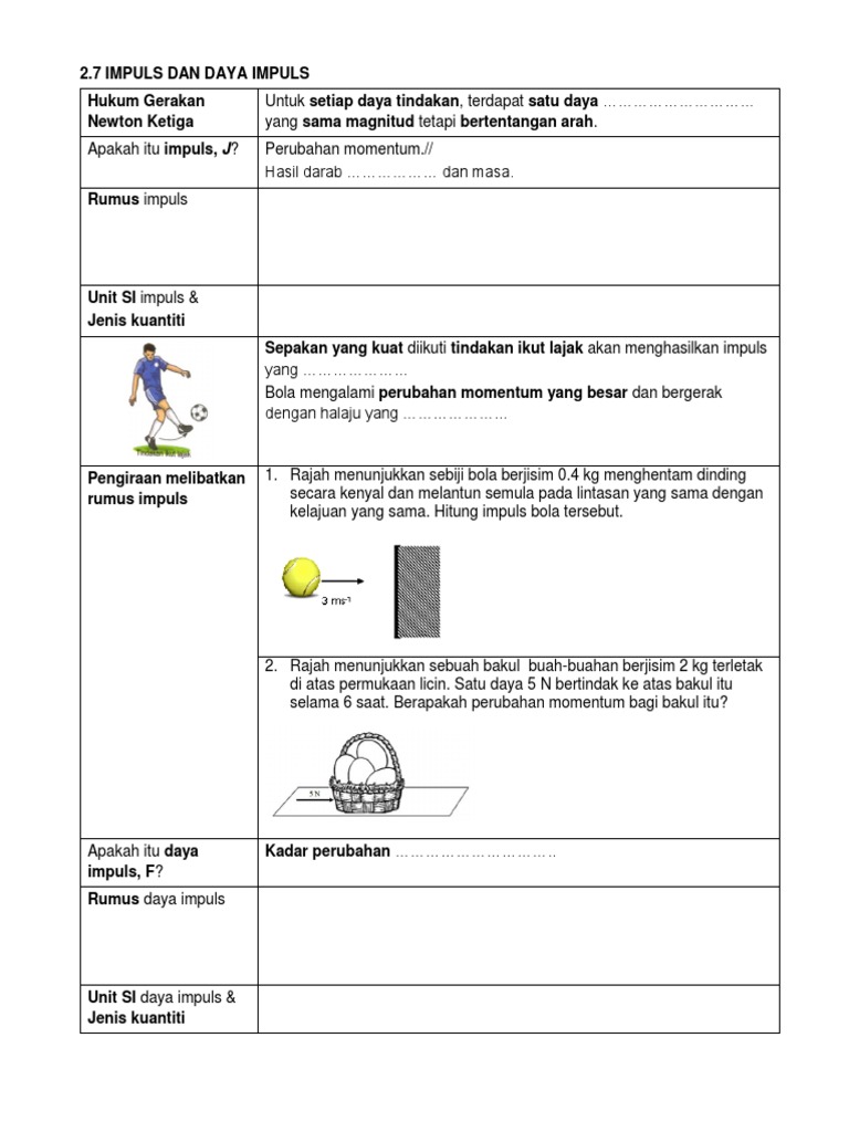 F mv-mut dimana t ialah masa perlanggaran. 2A12m - keseimbangan daya melibatkan daya geseran. 2A10m - Daya impuls sewaktu menyepak bola dan batu.